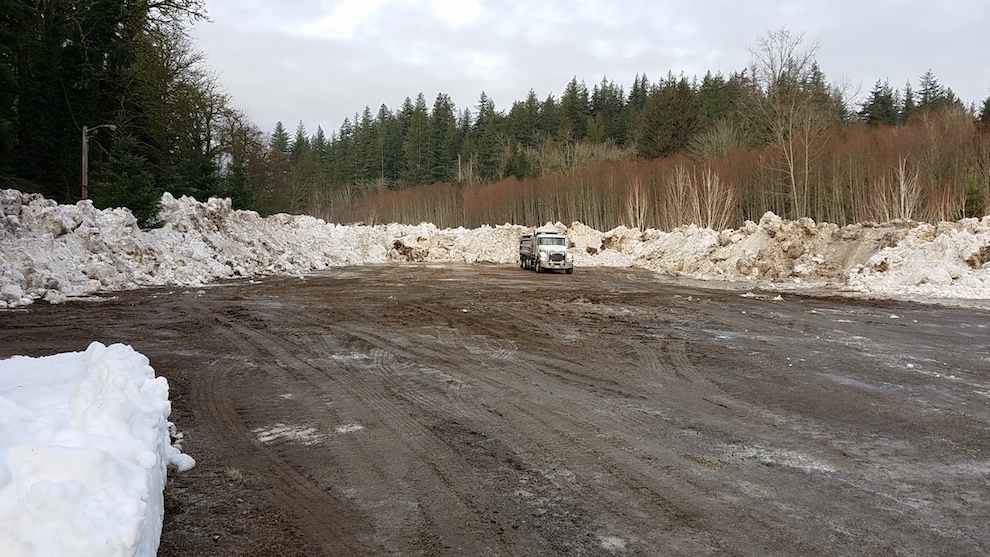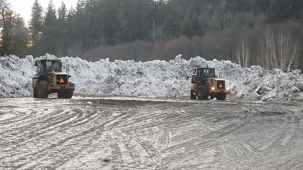 At one point, 18 pieces of heavy equipment – including plows, front loaders, back hoes, dump trucks, and other city and contractor vehicles – were moving massive amounts of snow to a central location on the vacant lot at the corner of Snoqualmie Parkway and State Route 202.