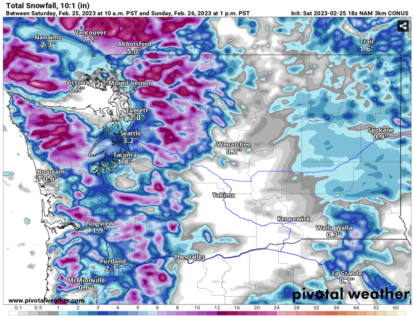 Starting at 8 pm tonight, Western Washington will be under a Weather Advisory until 10 am Sunday. A wide range of snow totals is possible, but generally should be around 3” for most.