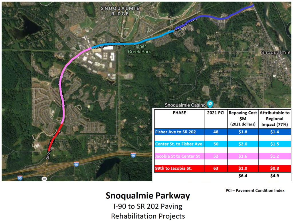 In addition to funding city-wide street repaving, a portion has been accumulated annually towards the eventual Parkway repaving cost (over $750k has been accumulated over the last decade). This has worked for years because most roads are on Snoqualmie Ridge and were new, needing little capital maintenance.