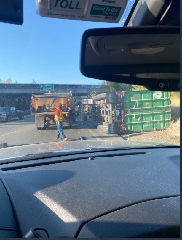 The Washington State Patrol said a semi-truck overturned at exit 25 as it turned on to WB SR 18 from WB I-90 around 8:00 AM Tuesday, July 29th, 2021.