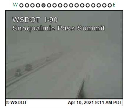 Snow and slush on the roadway. Chains required on all vehicles except AWD/4WD, oversized vehicles prohibited, eastbound five miles west of the summit at milepost 47 near Denny Creek and westbound four miles east of the summit at milepost 56 near Gold Creek.