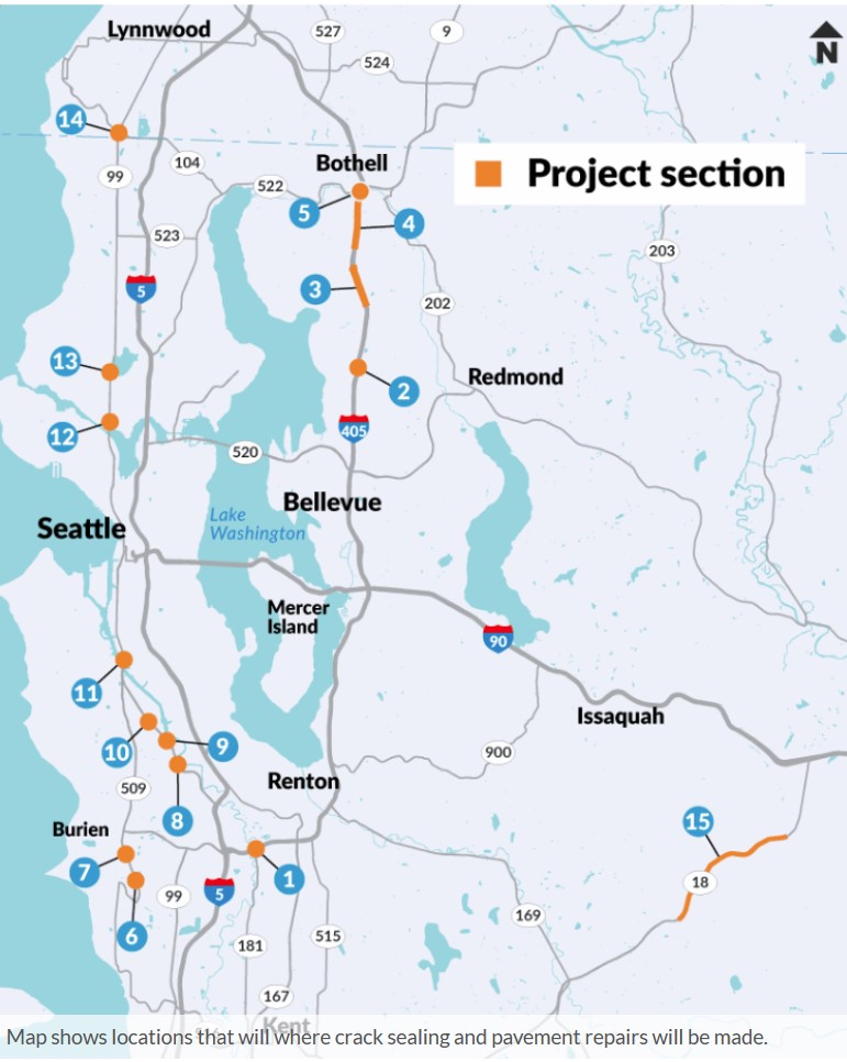 Contractor crews working for the Washington State Department of Transportation will seal cracks and make pavement repairs, creating a smoother ride and extending the lifespan of roadways at 15 locations in King and Snohomish counties.