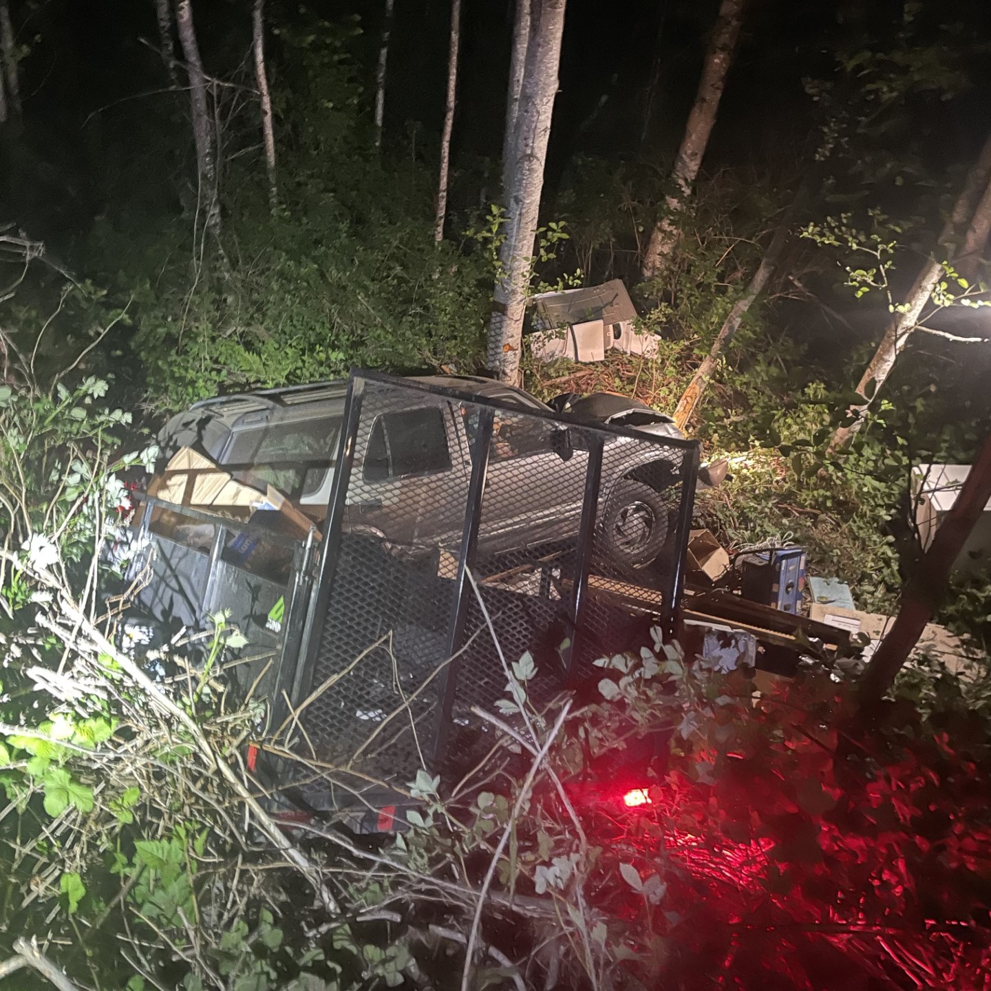 A male driving a truck with a trailer was traveling down Snoqualmie Parkway, veered to the left, drove across the oncoming lanes and crashed 25 feet down a ravine near Allman Ave. Firefighters rescued The driver from the vehicle with assistance from police officers. The subject was suspected of DUI and transported to the hospital for his injuries. Officers obtained a blood search warrant, and a blood draw was conducted. The male remained at the hospital for treatment of his injuries.