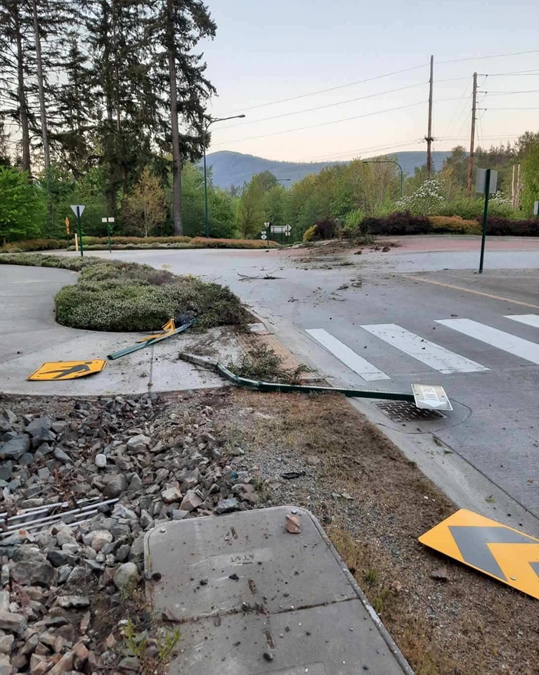 Following an area check, the Washington State Patrol advised officers of a vehicle colliding with a barricade. Officers found extensive damage, debris, and downed signs at the Tokul roundabout on SR 202.