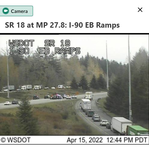 The left lane of Eastbound I-90 at SR 18 is the only lane blocked. It will remain blocked for an unknown length of time. Use caution through the area.