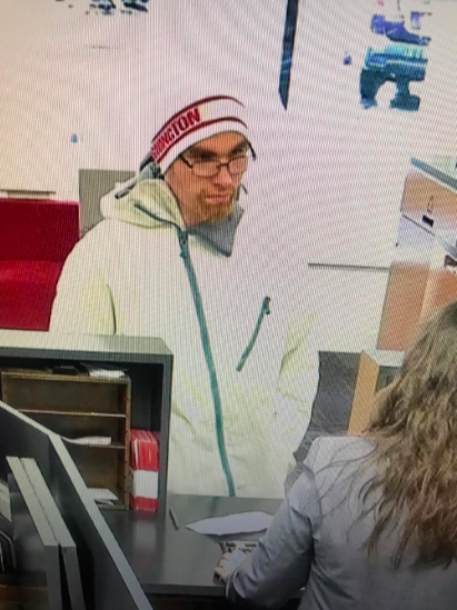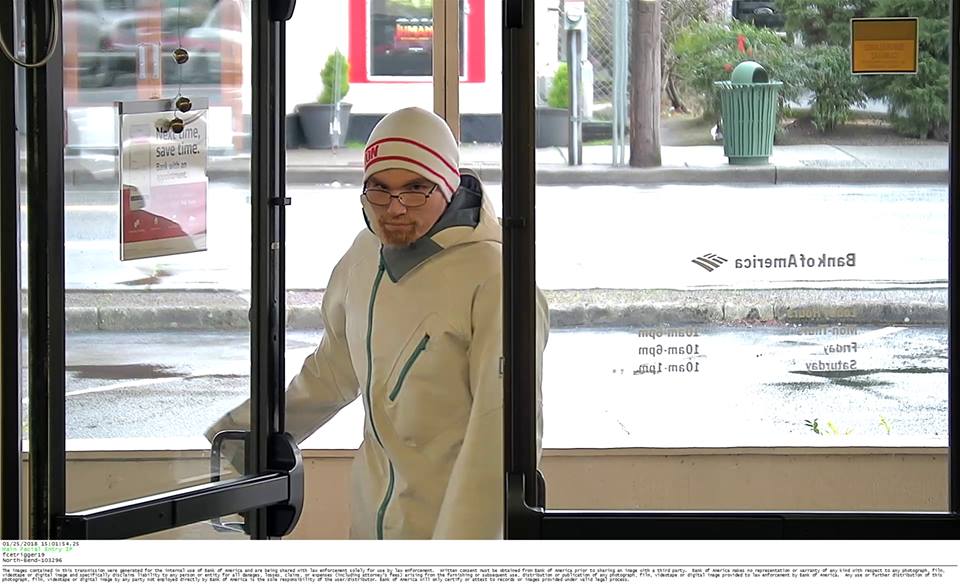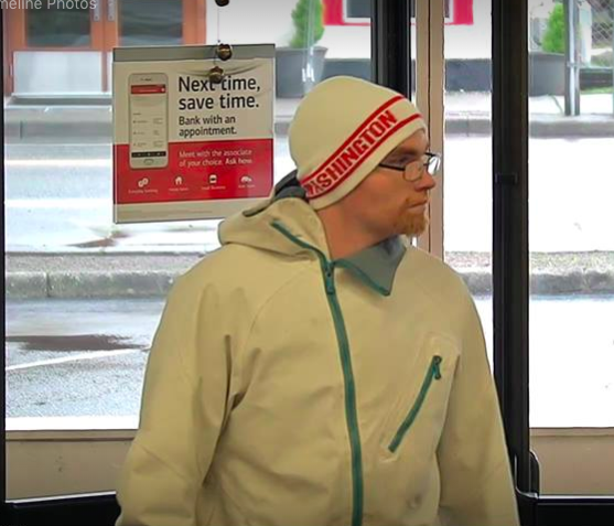 According to a press release, the robbery occurred around 3:05PM. The suspect is described as a Caucasian male, 6’0, slim build, wearing a white jacket with hoody, glasses, goatee, white beeny hat with red lettering “Washington” and tan pants.