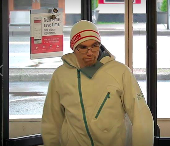 According to a press release, the robbery occurred around 3:05PM. The suspect is described as a Caucasian male, 6’0, slim build, wearing a white jacket with hoody, glasses, goatee, white beeny hat with red lettering “Washington” and tan pants.