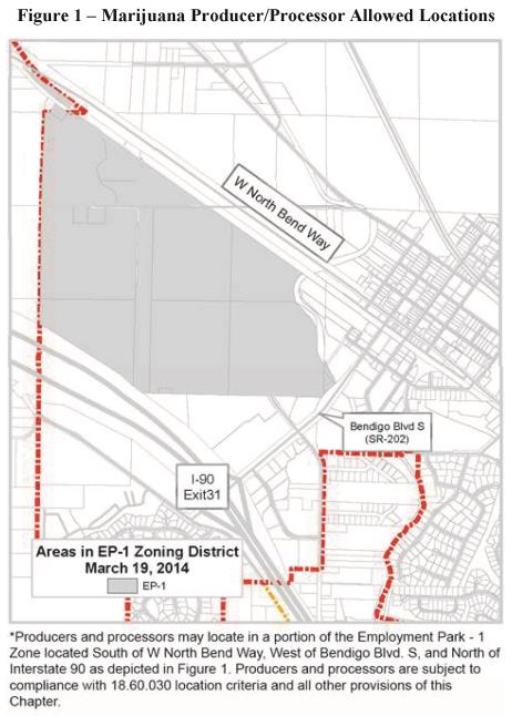 The North Bend Municipal Code on Marijuana Regulation limits marijuana producers/processors to specific locations within the city – south of W. North Bend Way, West of Bendigo Blvd and north of I-90 – and prohibits production and processing within any residentially zoned district or residence in the city.