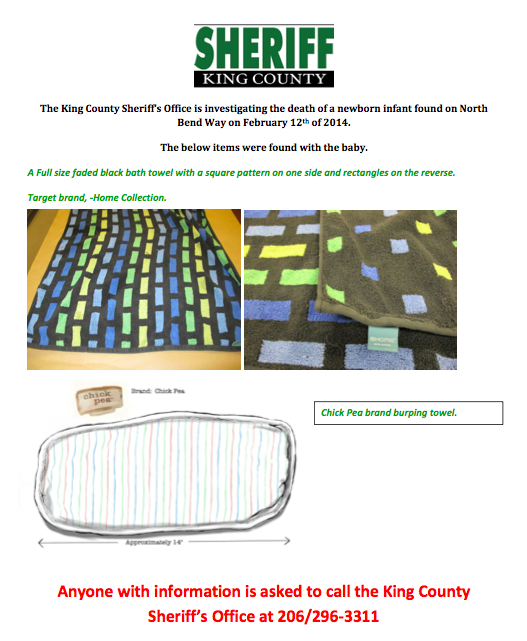 KCSO detectives released this photo of a burping rag found with a deceased newborn along North Bend Way on February 12, 2014.