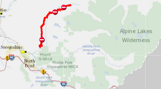 A large section of North Fork Road SE is closed due to the wildfire burning on Campbell Global and Mt. Baker-Snoqualmie National Forest lands.