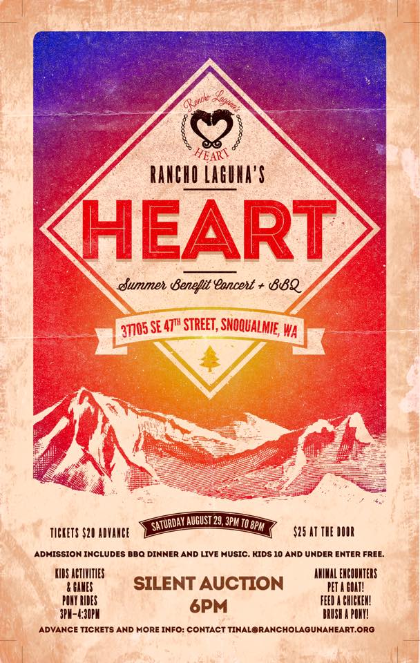 This Saturday, August 29, 2015, Rancho Laguna’s HEART is holding its 2nd Annual Summer Benefit Concert & BBQ at their rescue ranch, located 37705 SE 47th Street in Snoqualmie.