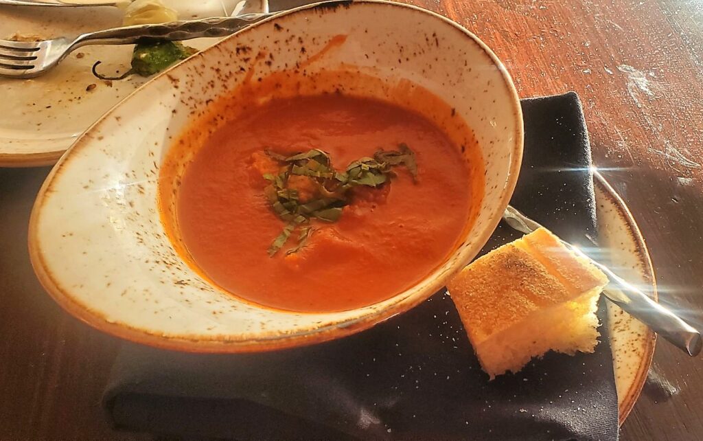 Our main courses arrived, and I continued my theme with the Tomato Soup with olive oil, basil and peasant bread. I am a sucker for Tomato soup but usually satisfy myself with the Safeway deli type. This was a much lighter tarter-style soup served with a delicious warm chunk of bread. At this point, I was almost at my food limit for the day but somehow managed to eat most of the warm, delicious blend.