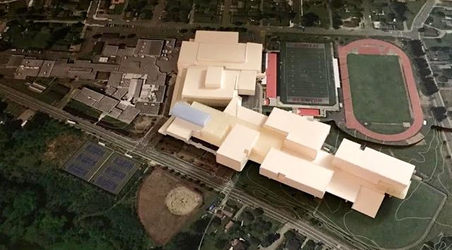 Earlier project estimates had the multi-phase construction lasting until 2022, with only 50-60% of construction being completed by 2019. Building on the current softball and baseball fields, though, allows 90% of the project to be completed in one phase, with less disruption to students and less risk to the district.