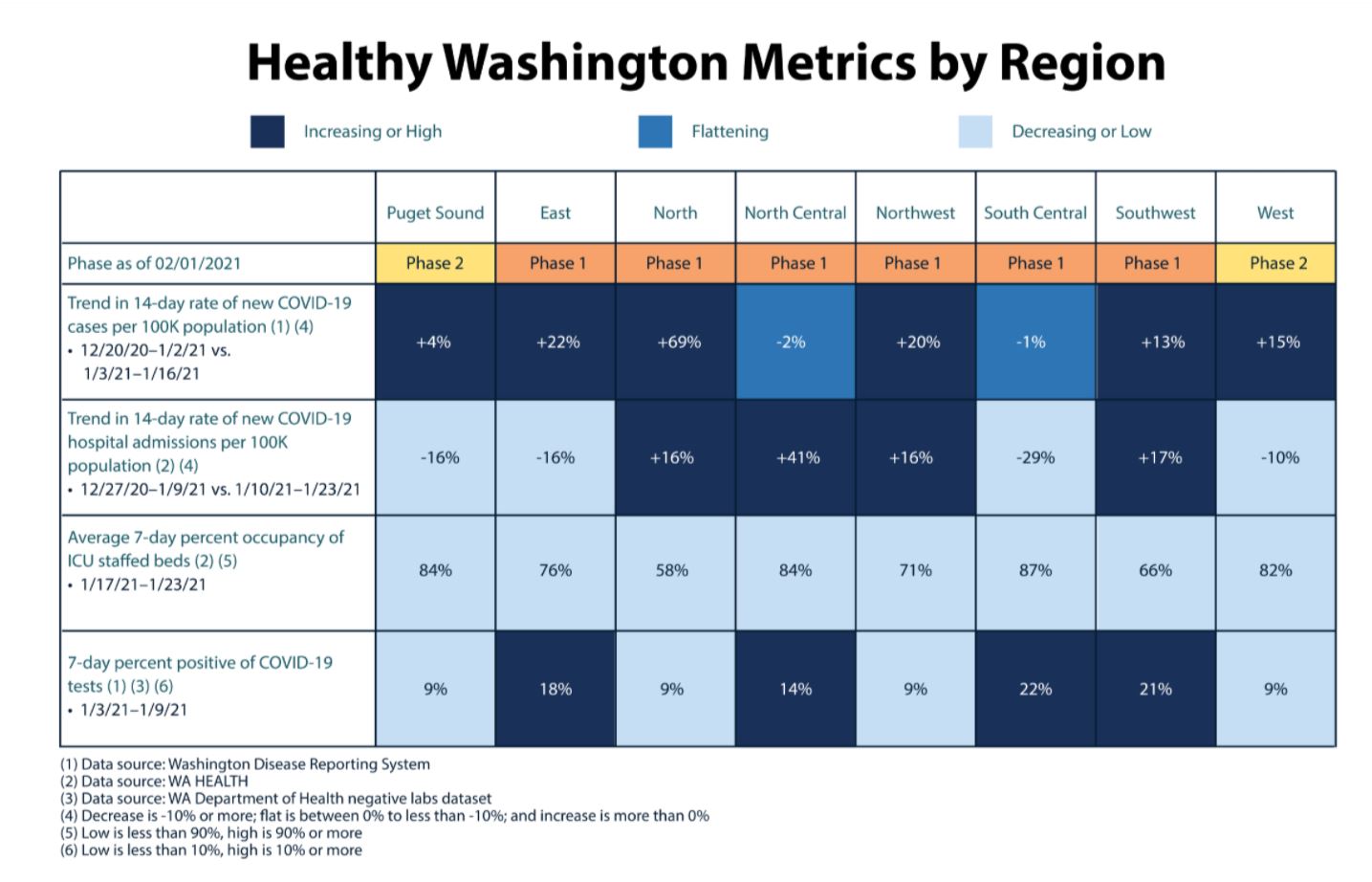DOH is releasing region status today to coincide with the Governor’s announcements. In the future, DOH will reassess the metrics for all eight (8) regions every two weeks and announce any phase adjustments on Friday. The next announcement will be Friday, February 12, 2021.
