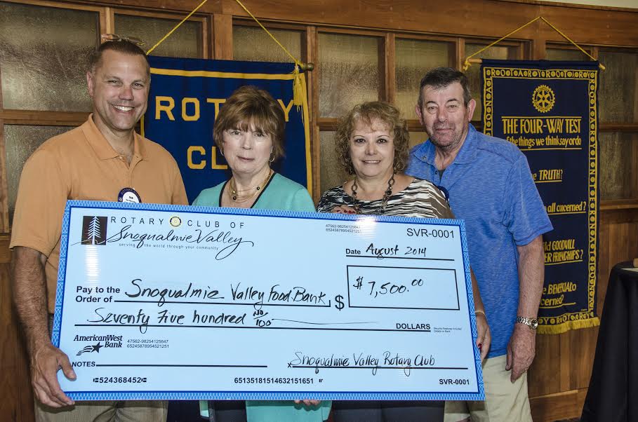 This past June, two special Snoqualmie Valley Rotary sponsored events reaped big rewards for area charities and continued the Rotary’s mission to feed the hungry. Thursday, August 28, 2014, Rotary members met for their monthly breakfast meeting and presented a $7,500 donation check to the Snoqualmie Valley Food Bank.