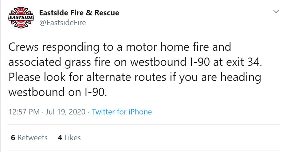 According to Eastside Fire & Rescue, the RV fire was extinguished by 1:15PM and crews were working to knock down the resulting grass fire. Drivers were asked find alternate routes while crews responded.