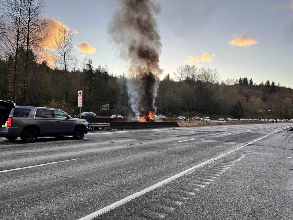 Update 6:10 PM: According to the Washington State Patrol, the driver of one of the vehicles involved is sadly deceased at the scene. The other driver is uninjured. The WSP is closing WB I-90 and diverting traffic off to exit 22. Expect a lengthy closure.