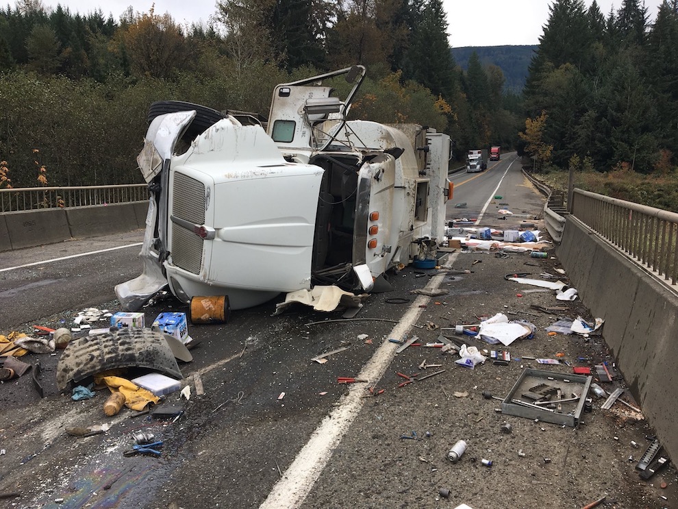 SR 18 reopened just before 4PM. The roadway between the Tiger Mountain summit and I-90 was closed for approximately six hours. Police said initial indicators were that a mechanical failure/issue caused the semi to roll.