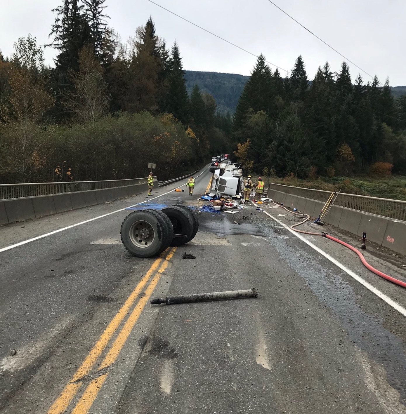 The accident occurred near the Raging River bridge (milepost 26). WSP reported the truck was leaking diesel fuel on the roadway.