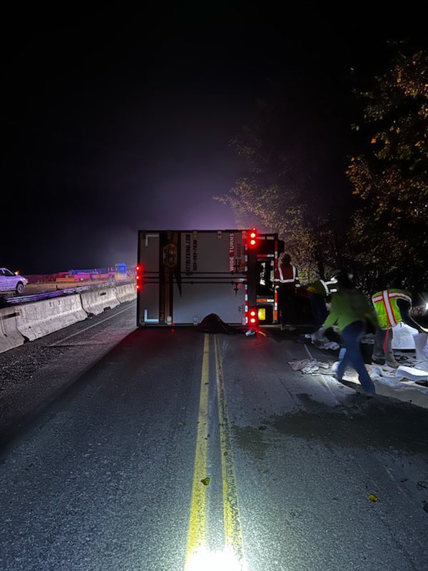 Following the collision, the 2023 truck rolled onto its side, obstructing both highway directions. The other vehicle also came to rest, blocking the westbound lanes.