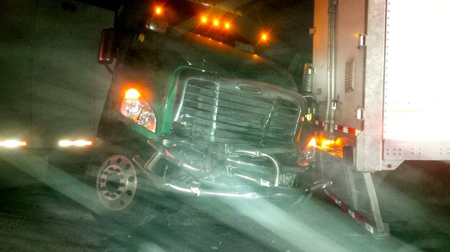 Three semi trucks collided on the westbound I-90 exit 34 off ramp near North Bend early Wednesday morning, September 30, 2015, closing the off ramp for nearly five hours.