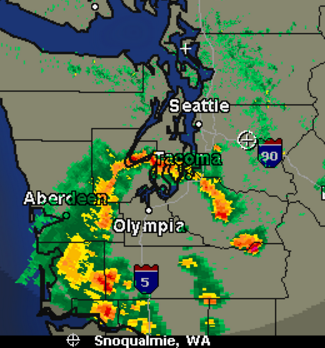 At 3PM, May 4, 2017, the National Weather Service said a long line of thunderstorms were heading north through the Puget Sound region, expected to impact areas of Seattle to Issaquah to Maple Valley to North Bend.