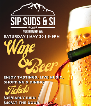 The North Bend Downtown Foundation is excited to announce the return of the Sip, Suds and Si tasting event on Saturday, May 20, 6:00 – 9:00 pm.
