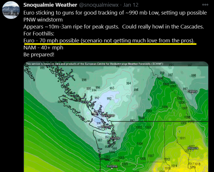 The problem is we’re too often fed one baseline forecast that is all encompassed by the mucky law of averages with little awareness of the standard deviation of possibilities from the mean. Unless your confidence interval is extremely high, only forecasting a wind gust range of say 30-35 mph when there are other models (and very good ones at that) saying 60+ mph, clearly this isn’t enough information for the public and municipalities to be adequately prepared. Forecasting a mean range often suffices for the more predictable gap winds in my experience, but not for a nascent developing Low off the coast, seemingly headed for an ideal storm track that would actually generate the first major PNW windstorm we’ve seen in some time.