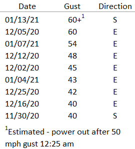 Top Wind Gusts – Snoqualmie Ridge (2020/21):