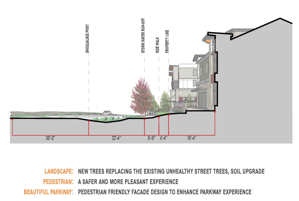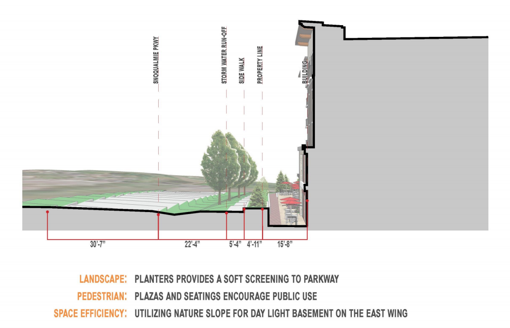 As currently planned, buildings will essentially front Snoqualmie Parkway – something the city’s planning department said was necessary due to a Puget Sound Energy power line easement that prevents buildings from being constructed on approximately 50% of the 4-acre land parcel. [Much of the unbuildable portion is located farther from the Parkway.]