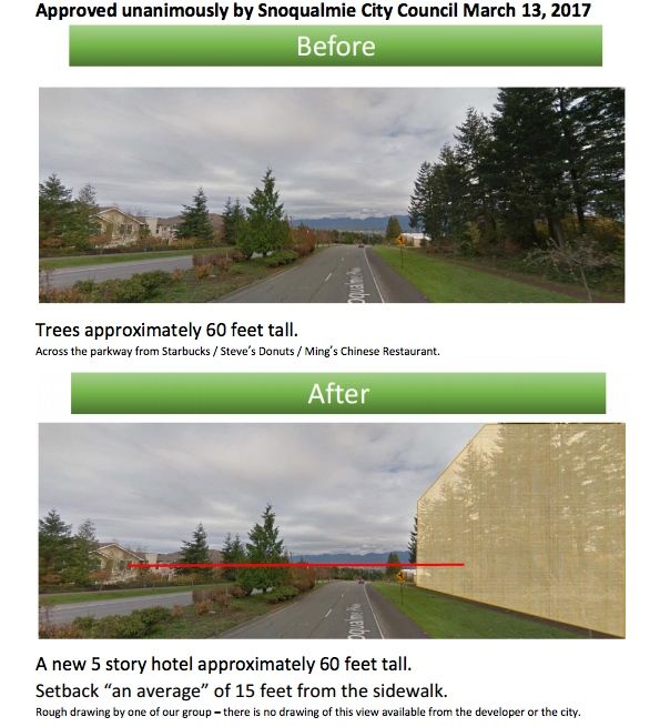 Hi Peggy, can you post that on FB somewhere so that we can all see it? I think one of the problems is the way this was all handled with the residents of our fine community. For instance, the Shell station on the corner of Douglas and Snoqualmie Parkway looks quite nice and very much in keeping with our community. I don’t feel like these renditions they are providing us of the future Hampton Inn look very appealing. They appear very boxy with not much architectural interest . If we have to be accepting of this large structure, it would be great to have some input about the overall look. More stacked stone or even better, river rock, along with more wood, similar to Salish Lodge. That look would be in keeping with our community. I’m sorry to say this, but Hampton Inn’s have a cheap appearance. They are relatively inexpensive to stay, and they reflect that in their exteriors. They look very commercial and don’t have an inviting look to them. What can we as residents of this community do about that? We’ve had to put up with it being shoved down our throat to begin with. Just seems quite unfair to those opposed to it. If residents were made to feel like they were part of it with certain choices, I think it would make a big difference in the way we feel about the encroachment of this large structure in our community. The prices that we are now paying for real estate here are incredible and in keeping with that I think we should have a high-end hotel, something exclusive. This will attract people that can afford it, not riffraff. Let’s not be cheap, just because it might be a little less for family to stay during the holidays. All the other months of the year we will have to be living with this. I’m someone who has lived a lot of places and bought and sold a great deal of real estate. I’m getting the feeling that a lot of the people that are speaking up are quite young and lack experience. That’s OK we all have to start somewhere that’s part of life. I’m not here to make anyone feel bad just stating the obvious.