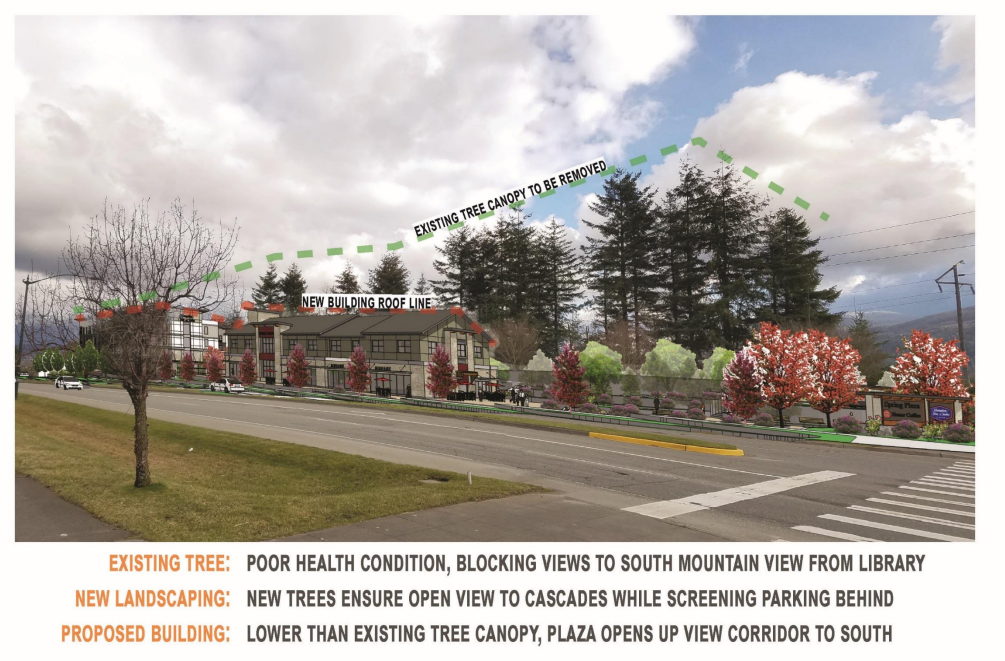The hotel will be 4 and 5 stories, with the 5-story area located on the downslope of the property closer to the Fairway Ave intersection. The existing 50 foot, raised land buffer with tall trees that borders the Snoqualmie Parkway sidewalk will be removed for the hotel and retail buildings. A new driveway entrance will also be added to the property from Snoqualmie Parkway – similar to the one installed for the nearby grocery store development under construction.
