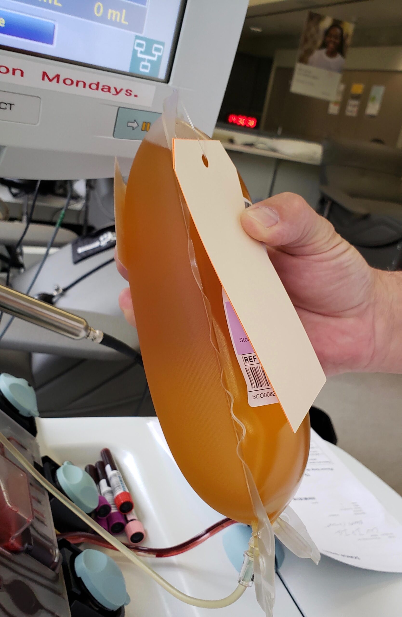 Larson first provided blood samples at the University of Washington for multiple COVID-19 vaccine studies. Once his antibodies were verified, he was referred to Bloodworks Northwest for the 840ml plasma donation.