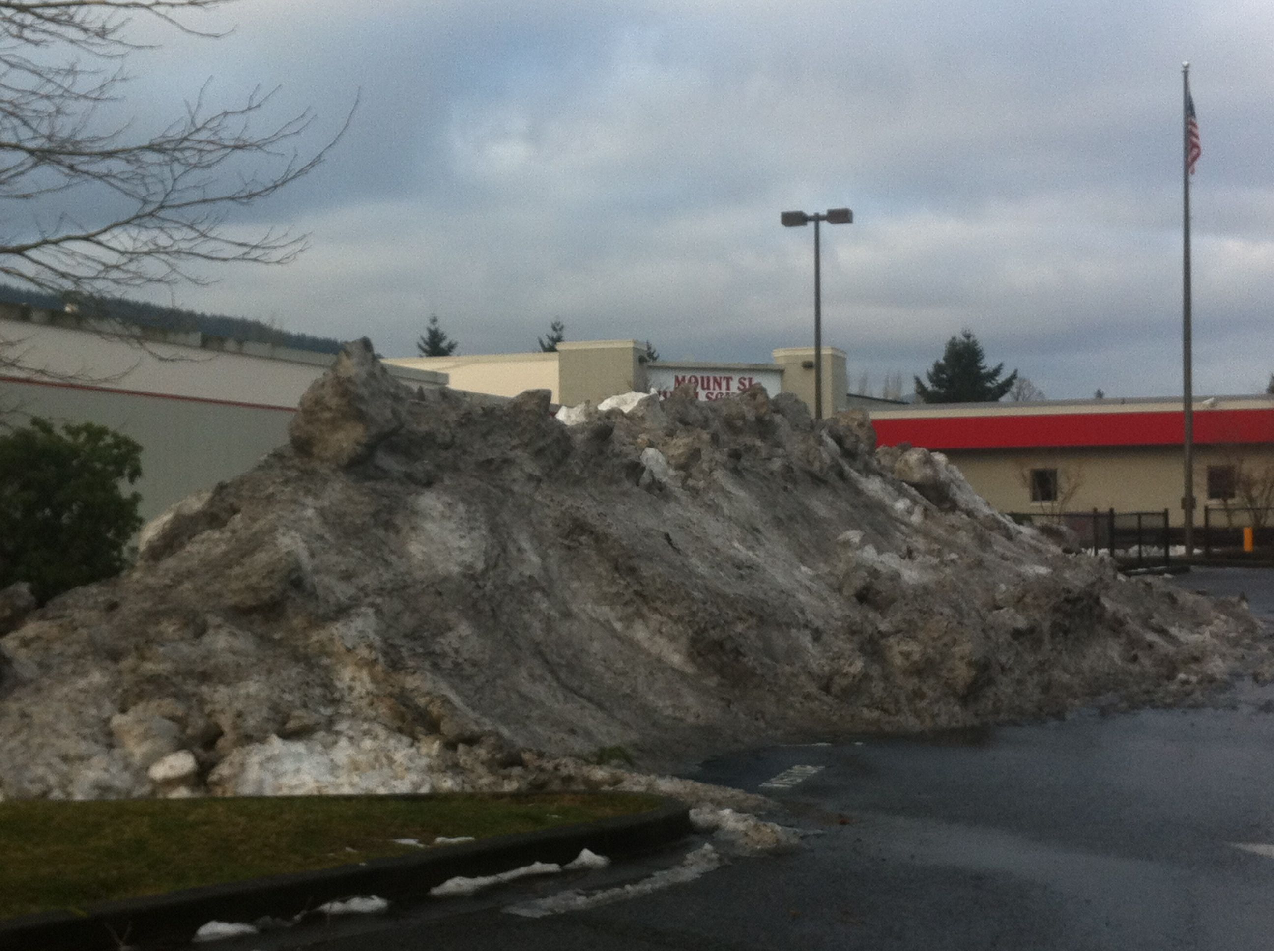 MSHS seniors have a tradition of pulling one big senior prank.  A lot of high schools do it.   Underclassmen wait for it.  If you’ve been to the high school since last week you’ve seen it – the nearly 50 ft. long and probably 10 ft. tall (at its peak) snow pile that encompasses all the visitor’s parking spaces.  Well, as of this morning, part of that pile has moved.  It didn’t move far, though.  Just across the bus lane to block the school’s front doors.  And just so everyone knows who was responsible, “2012” was spray painted across it.