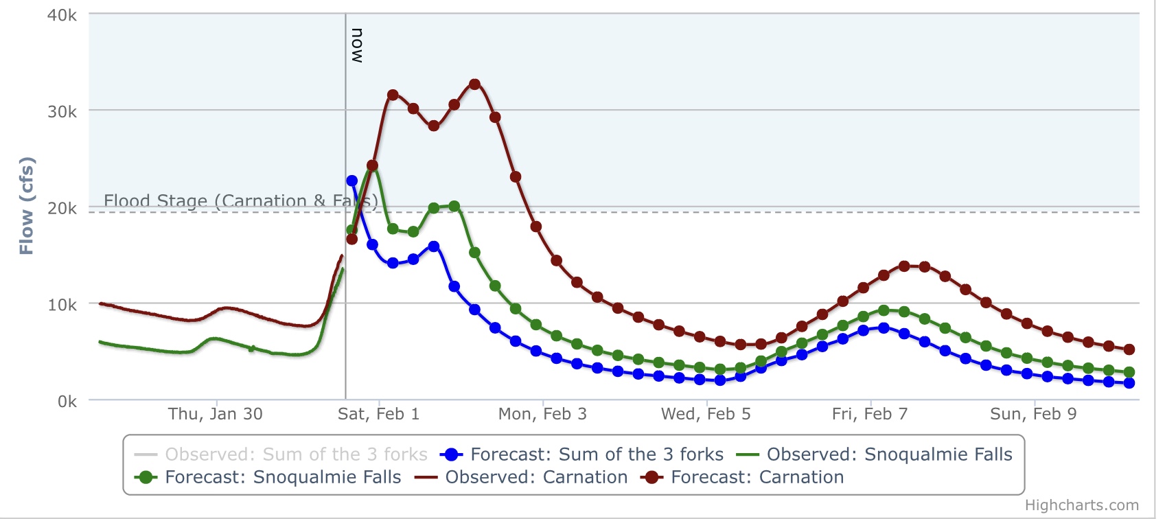 Rain re-intensifies Saturday, Feb. 1st, with periods of gusty southwesterly winds likely. The Snoqualmie river looks to crest this weekend as the snow levels have been well above pass levels. Near the Falls, levels appear to reach ‘minor’ flood stage while near Carnation reach ‘moderate.’