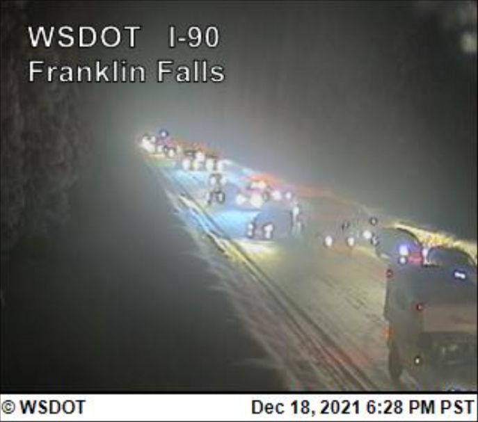 FINAL UPDATE 10:13 PM: I-90 is open in both directions between North Bend and Cle Elum after blocking collisions closed the pass earlier tonight.