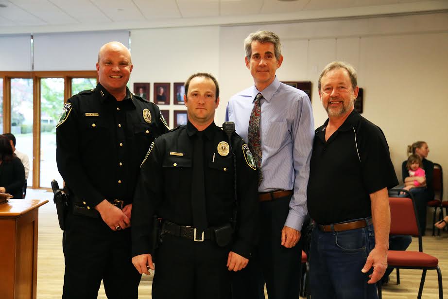 Snoqualmie Police Chief Steve McCulley, Officer Patterson, Snoqualmie Mayor Matt Larson and North Bend Mayor Ken Hearing, May 11, 2015.