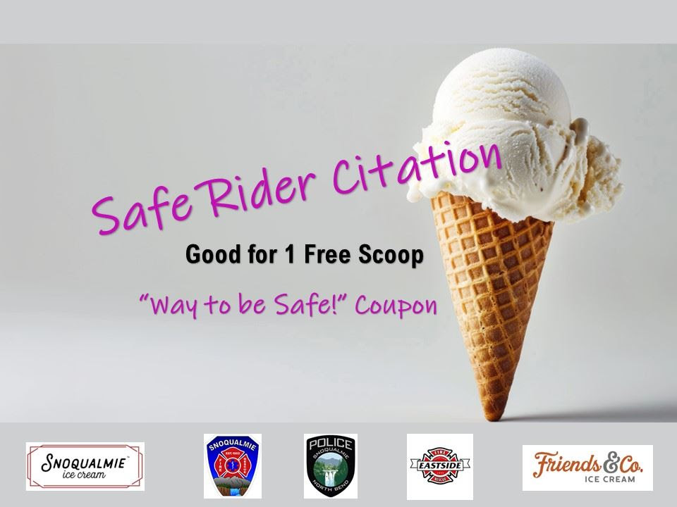 Officers from the Snoqualmie Police Department, alongside firefighters from Snoqualmie and Eastside Fire and Rescue, will distribute Safe Rider coupons, redeemable at Snoqualmie Ice Cream or Friends & Co. Ice Cream in North Bend, through August 31, 2024.