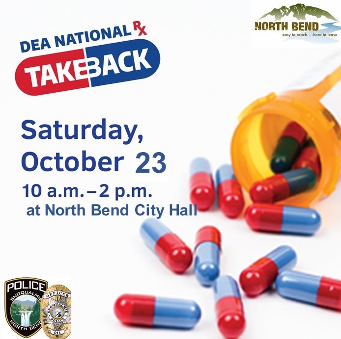 Community members can bring pills for disposal to North Bend City Hall, 920 SE Cedar Falls Way, or the Snoqualmie Fire Department at 37600 Snoqualmie Parkway. (The DEA cannot accept liquids or needles or sharps, only pills or patches.) The service is free and anonymous, with no questions asked.