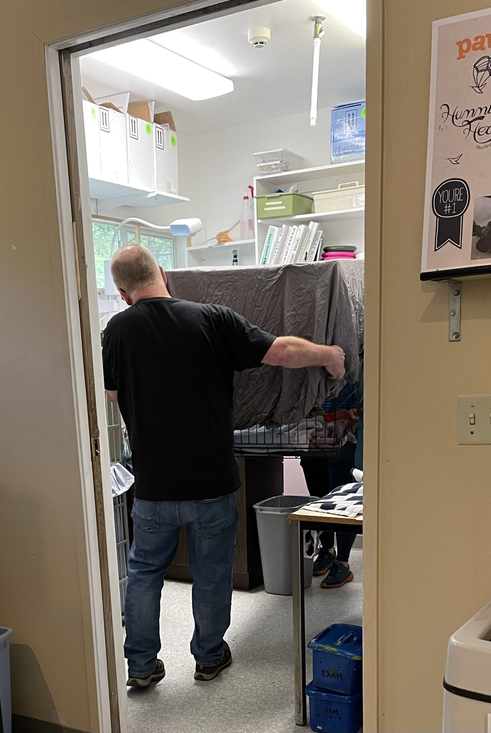 Since Susan had called PAWS on the way there to let them know they’d been successful at catching the eagle, they were ready when she got there. Veterinarians did a quick exam and placed the eagle in a dark room.