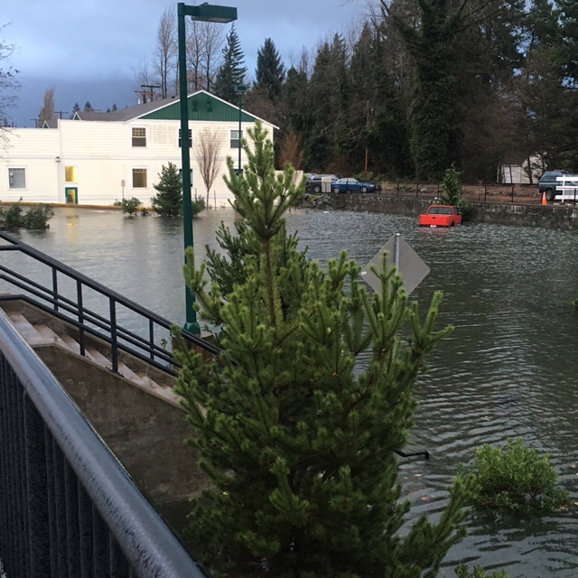 Flood waters were affecting areas of North Bend, including strip mall parking lots. An outbuilding at the Mt. Si Senior Center had a couple of feet of water in it.