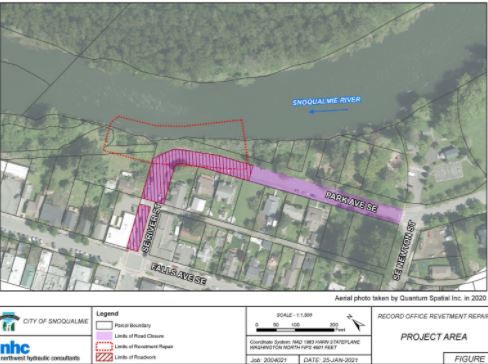 The City of Snoqualmie, with funding from the King County Flood Control District, will be repairing the existing river revetment. The repair will protect properties and structures along the roadway and stabilize a city water main and buried utility infrastructure. Without the repair continued river erosion will likely cause the road to fail entirely.