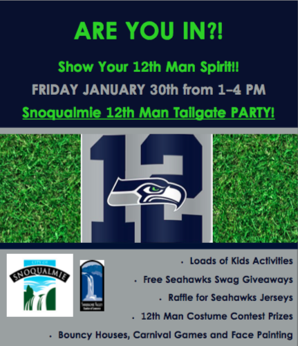 The 12th Man Tailgate Party happens in the Snoqualmie Valley YMCA parking lot, Friday, January 30th from 1PM – 4PM.