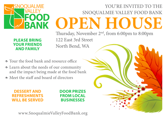 Snoqualmie Valley residents are invited to a special open house, Thursday, November 2, 2017 at the Snoqualmie Valley Food Bank in North Bend.