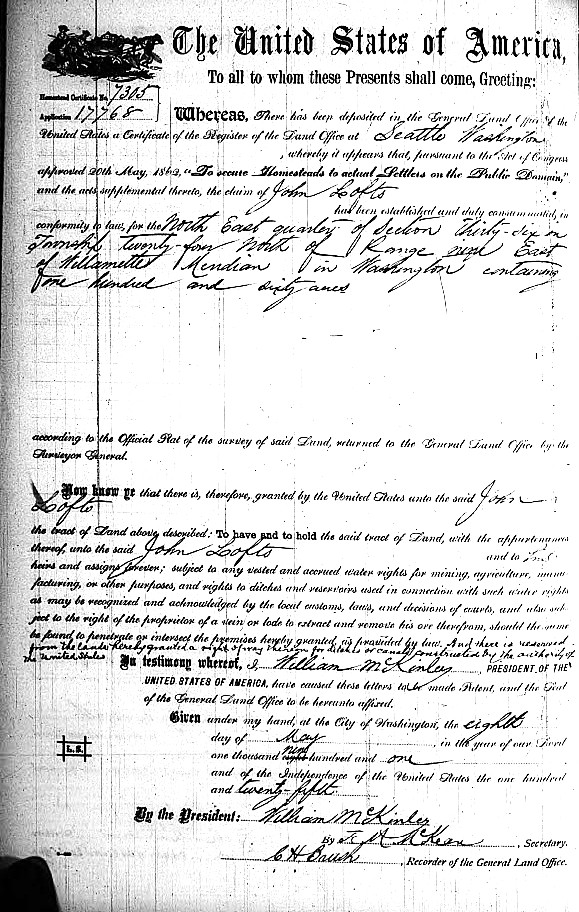 John Lofts chose to come west due to what he calls an instinct. He wrote: “It was the year 1888 that desire to own a small piece of land whereon to make a home…the herd instinct which causes animals – including mankind- to follow each other, impelled me to penetrate one of the numerous small valleys in the western foothills of the Cascade Mountains with the intention of squatting and later, when officially surveyed by the government, to file a homestead claim on 160 acres.”
