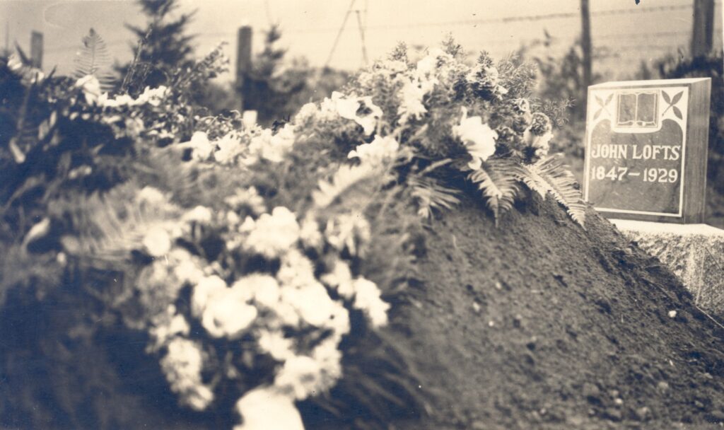 In July 1929, John Lofts was hit by a car. He convalesced at home under the care of his nephew Henry until his death on October 13th. He was buried in Mt. Si Memorial Cemetery at his request, where the mountain would always look over him.