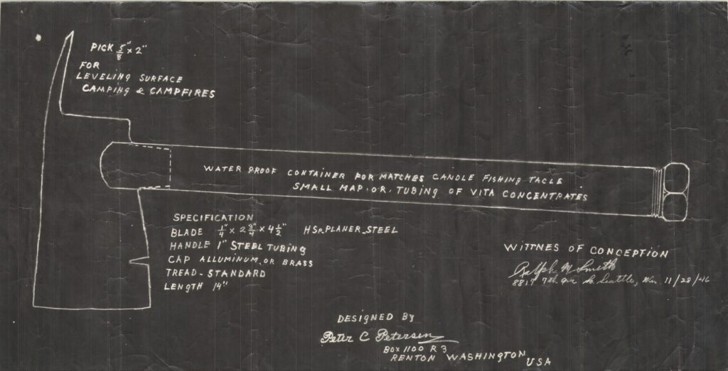 Peterson invented new technologies to use during his outdoor adventures. He patented some of his inventions to share them with others who enjoyed the outdoors. Among these inventions was a specialized hatchet with an inside compartment for matches or other tools you may need in the wilderness.