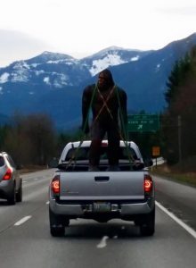 I had a sighting myself once coming home from a dental procedure. Slightly sedated, I looked up to see a giant Bigfoot standing in the back of a pickup truck on the freeway. After shaking the cobwebs away, I realized it was a giant statue on his way to some place either in or over the mountains. Perhaps a themed restaurant or maybe some slightly eccentric persons front yard. I snapped a photo but will never know where he ended up.