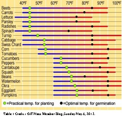 But, does this slightly warmer spring weather indicate that it is time to rush right out and start planting our vegetable gardens? Well, not really. Unfortunately, our area’s spring climate is unpredictable. In the Valley we can experience a frosty night right up to mid-April or later. For most seeds to germinate, the soil temperature has to be at 40 – 70˚ – colder for greens, warmer for squash. See the vegetable temperature growing guide—Table 1, from Cliff Mass Weather Blog, May 6, 2012. Investing in a soil thermometer will take the guesswork out – they aren’t expensive.