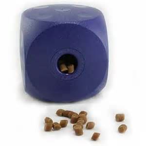 A Buster cubeIf you haven’t tried an interactive feeder, you need to go out and get one immediately! This little cubebuster cube is my favorite. You can fill it up with Fluffy’s dinner and watch the fun! At first your dog rolls it around and the food comes out very fast, but then it takes more time and effort. If your dog eats his meals in two seconds flat, this will take him far longer and will require thought and exercise. It’s a win-win for everyone. The Buster can be a bit noisy, so if you have an easily spooked pet, or are noise sensitive, you can try a Tricky Treat ball or a Kong.
